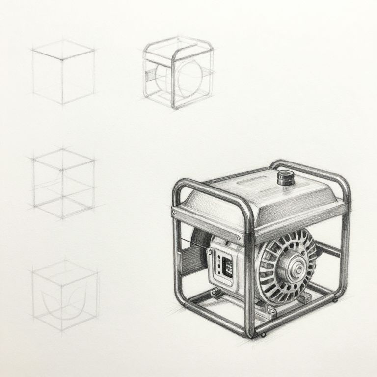 Easy drawing of a generator, step-by-step pencil sketch showing the progression from basic geometric forms to a detailed, realistic portable generator, soft shading and clear line work, perfect for illustrating drawing tutorials or beginner art books