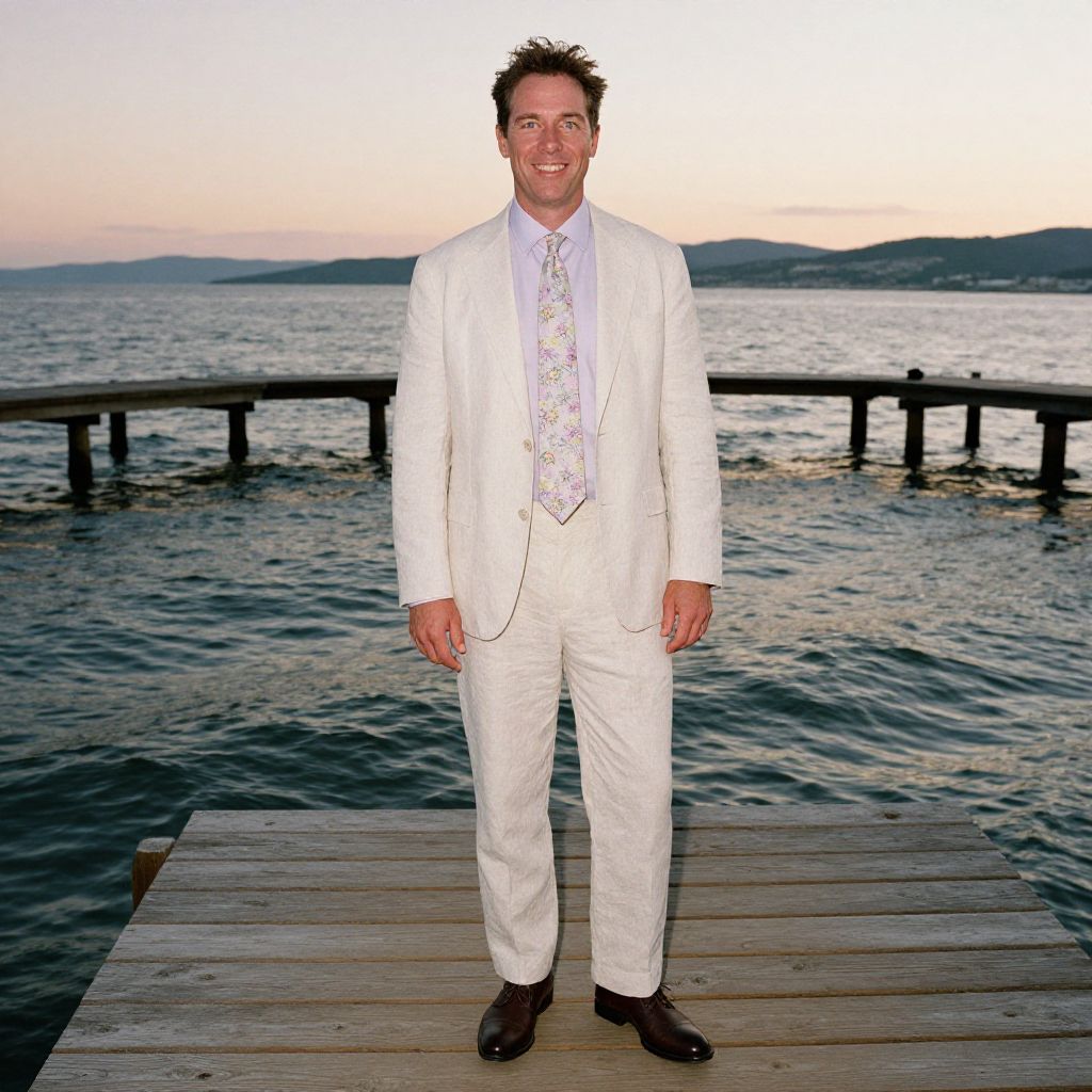A man, soft cream linen suit, light lavender dress shirt, pastel floral tie, dark brown oxford shoes, rustic wooden docks, gentle waves lapping, sunset over distant hills, medium format film, relaxed smile, warm and inviting expression. Man has masculine face and piercing eyes