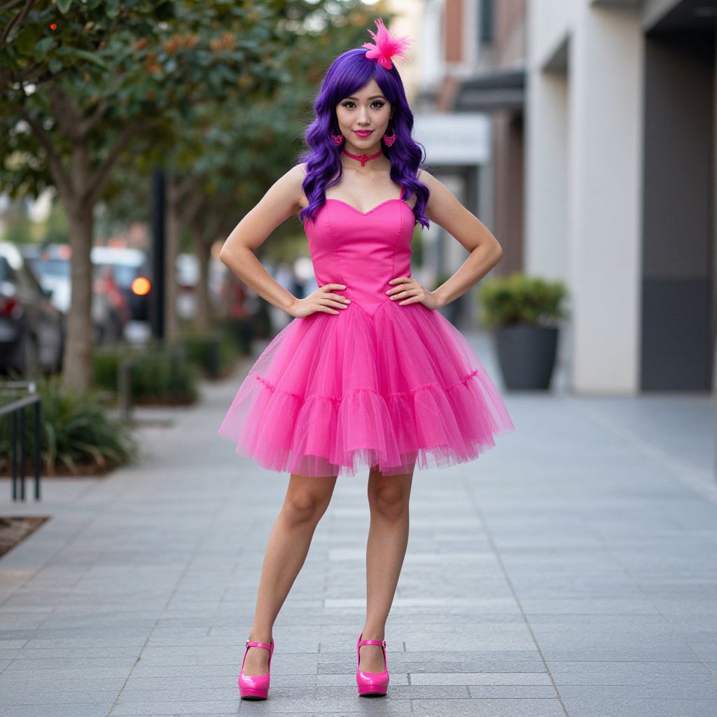 Photograph of a young Asian woman with purple hair, wearing a bright pink, tulle dress, pink shoes, and a pink hair accessory, standing