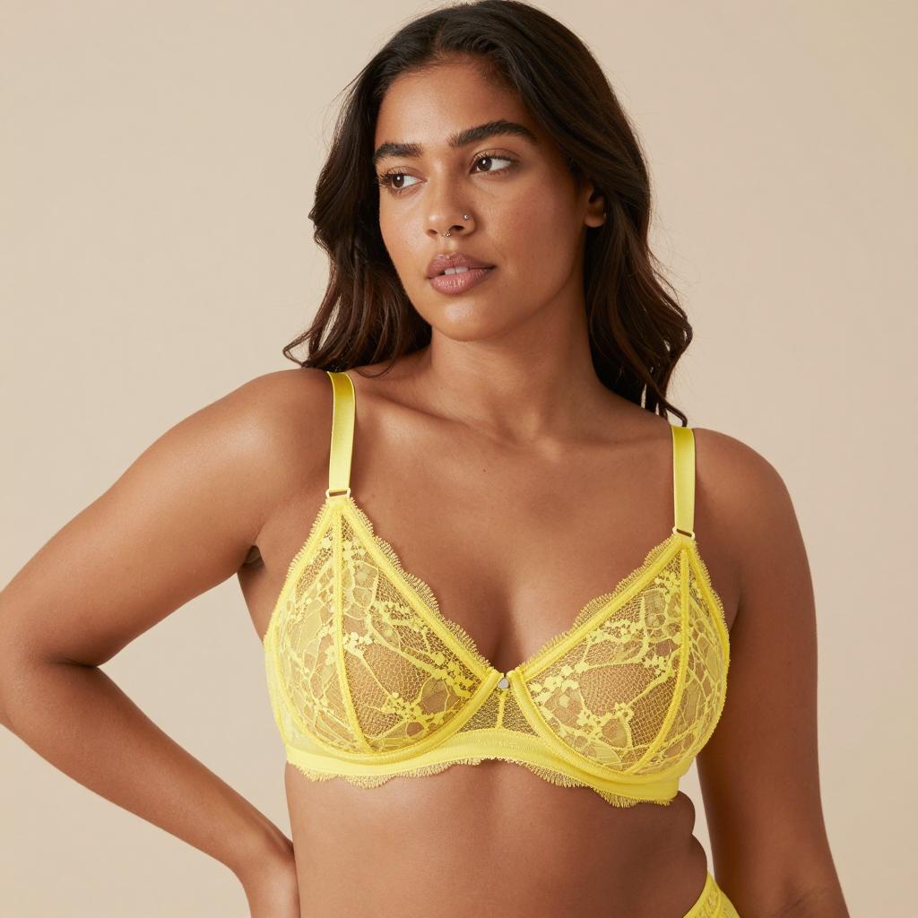 Photograph of a woman with light brown skin and dark brown hair, wearing a yellow lace bra. She has full lips slightly parted, looking to the side with a neutral expression. Her right arm rests on her hip. Background is plain and beige. The bra has lace patterns and yellow straps. The brand name "Fountaine" is visible on the bra band. She has a nose piercing. Her hair is shoulder-length and wavy.
