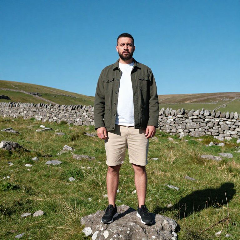 Photograph of a guy standing on a rock in a grassy hillside with a clear blue sky. He's got short dark hair, a beard, and a serious expression. He's wearing a dark green jacket over a white t-shirt, beige shorts, and black sneakers. Behind him, there's a stone wall and rolling green hills. The light is bright and the shadows are sharp.