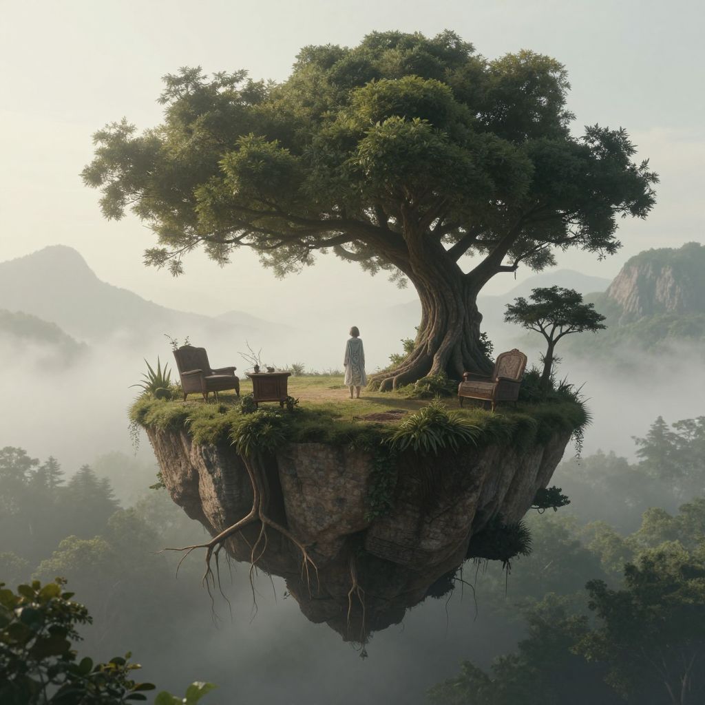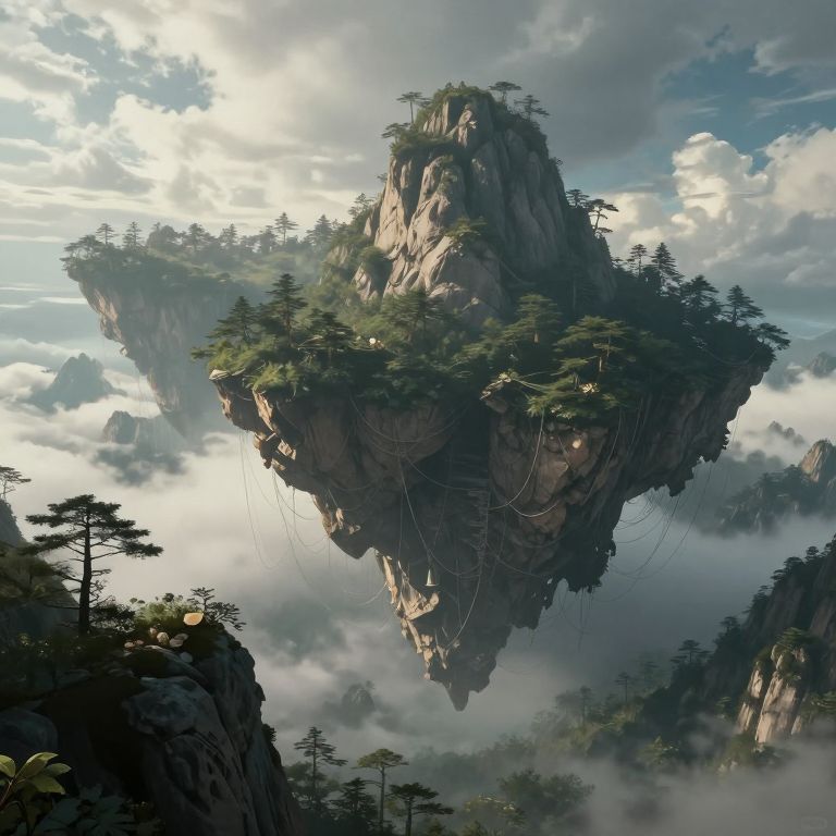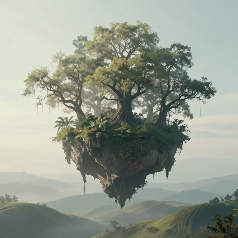 Suspended between earth and sky, a floating isle cradles ethereal trees whose inverted branches drip liquid memory, weaving a tapestry of serenity and introspection over windless hills suffused with the quiet promise of timeless dreams.