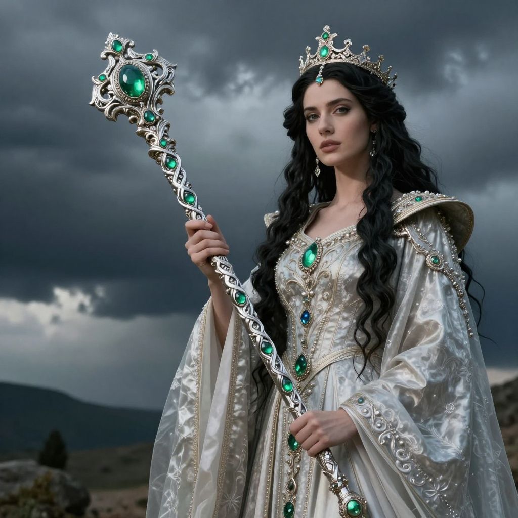 Ornate staff embedded with precious gems, twisting vine patterns inlaid with silver and emeralds, held by a regal sorceress in flowing robes, with a stormy sky behind