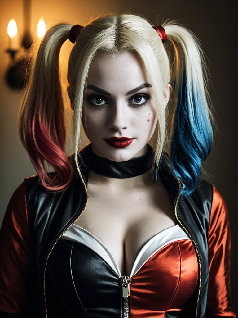 Close-up portrait of a woman cosplaying as Harley Quinn with blonde hair in pigtails dyed red and blue at the ends. She wears dramatic makeup featuring dark eye shadow and bold red lipstick, a black choker, and a shiny black and red costume with a zipper front. The background is softly lit with a warm light source resembling candles or sconces.