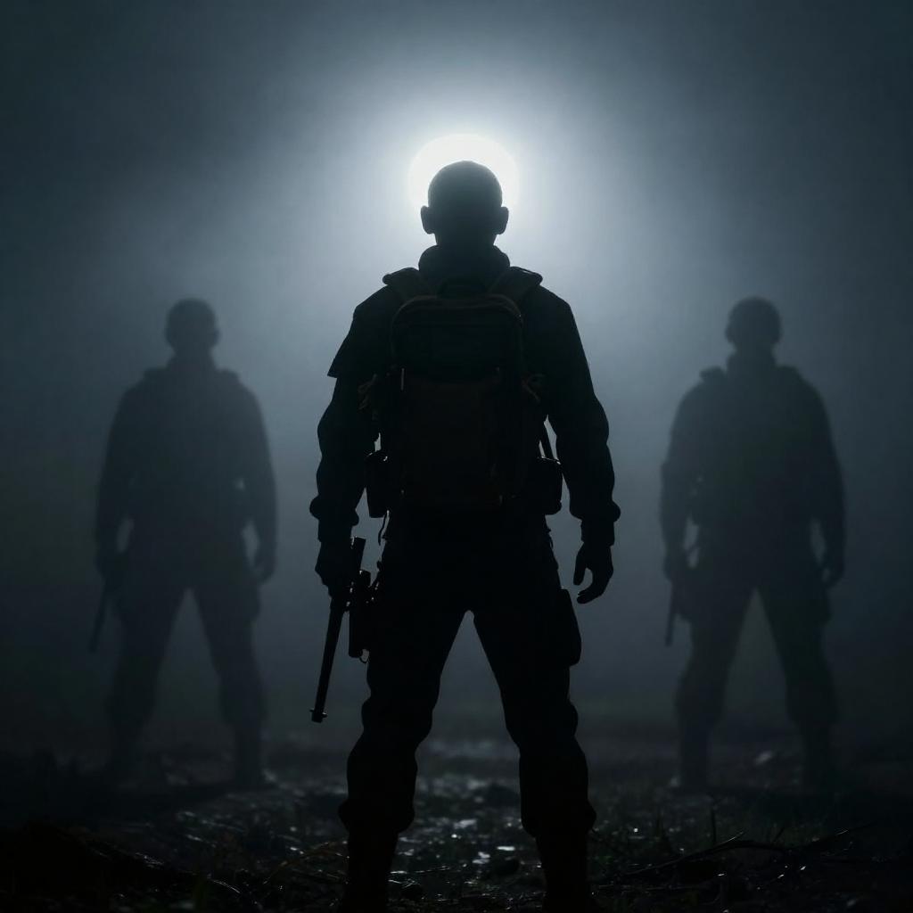 Three silhouetted soldiers stand in a dark, foggy environment with a bright light source behind the central figure. The main subject faces away from the camera, wearing tactical gear including a backpack and holding a gun. A smoky atmosphere contributes to the intense, shadowy ambiance.