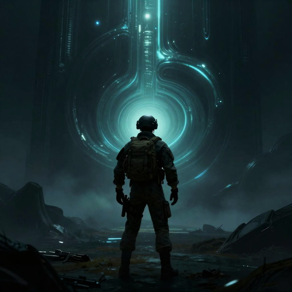 Silhouetted figure with a backpack and gun, standing in a dark, foggy environment. Bright, centered light source behind. Smoky ure fills the background. Figure's back facing the camera. Intense, shadowy ambiance.