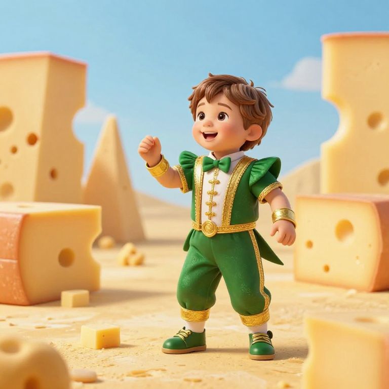 Photorealistic digital CGI image of a smiling, dark-haired, young boy in a green and gold medieval-style outfit with a white shirt adorned with gold stars. He stands confidently with one arm raised in a small fist. The background features a sandy, cheese-themed landscape with large, yellow Swiss cheese blocks and smaller cheese cubes scattered around. The sky is bright blue with a few white clouds. The boy's shoes are green with gold accents, and he wears matching gold bracelets. The overall style is whimsical and playful, with vibrant colors and detailed textures.