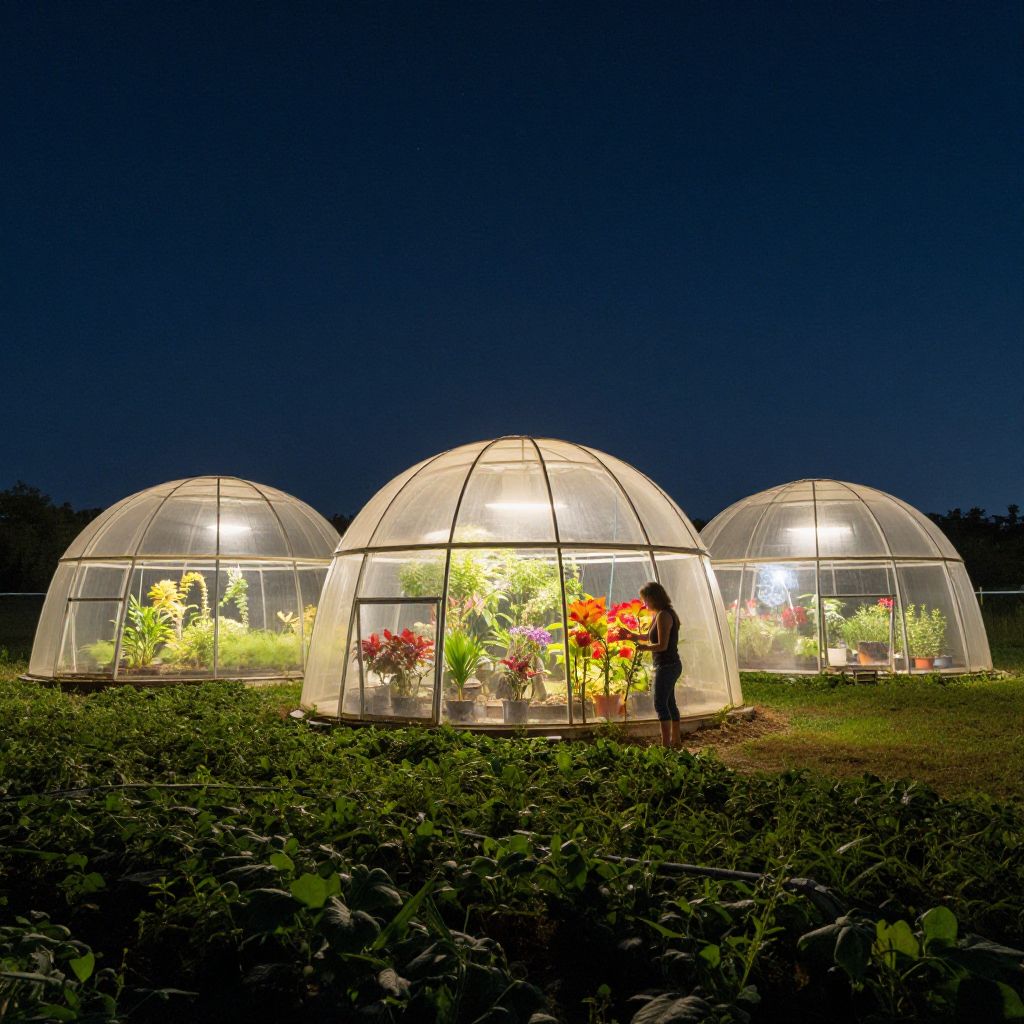 Photograph of three illuminated, transparent domed greenhouses at night, set on a grassy field with dark, leafy plants in the foreground. Each dome is brightly lit from inside, showcasing vibrant green and red potted plants. A silhouetted person stands to the right of the central dome, looking inside. The sky is a deep blue, contrasting with the warm, white light from the greenhouses. The domes are evenly spaced, creating a symmetrical composition.