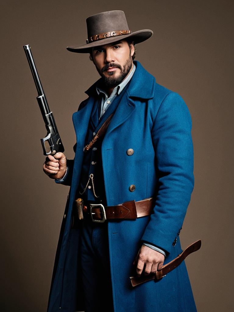 Django unchained blue, 1boy, male focus, solo, hat, weapon, belt, facial hair, holding, looking at viewer, coat, gun, beard, holding weapon, blue coat, standing, long sleeves, buttons, pants, holding gun, simple background, closed mouth, brown belt