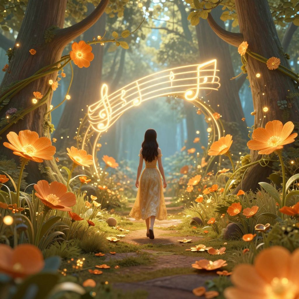 A serene 3D-rendered fantasy scene depicts a woman walking through a magical forest pathway adorned with golden-orange flowers and glowing vines, creating an ethereal ambiance reminiscent of a floating orchestra where music manifests as vibrant blooms and luminous arches.