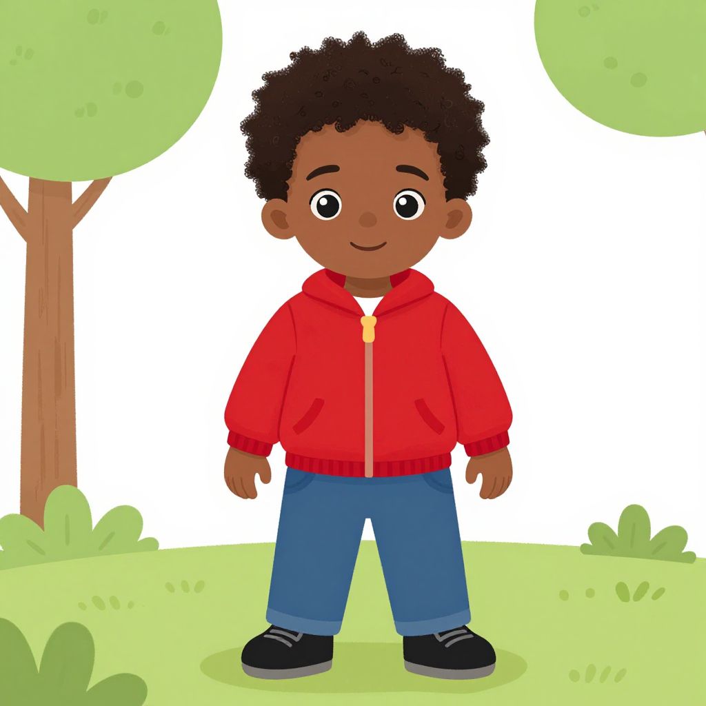 Digital illustration of a young Black boy with dark brown skin and curly black hair, standing in a grassy, tree-filled area. He has large, expressive black eyes and a small smile. He wears a bright red hoodie with a yellow zipper, blue jeans, and black sneakers. The background features light green trees and grass, with a simple, white backdrop. The boy's figure is centrally positioned, and his clothes and shoes are detailed with bold, solid colors. The overall style is cartoonish and vibrant, with clean lines and a friendly, approachable aesthetic.
