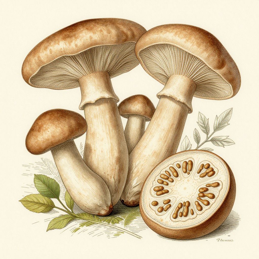 Detailed, colored illustration of five brown-capped mushrooms with white stems, one sliced to show gilled interior, surrounded by green leaves.