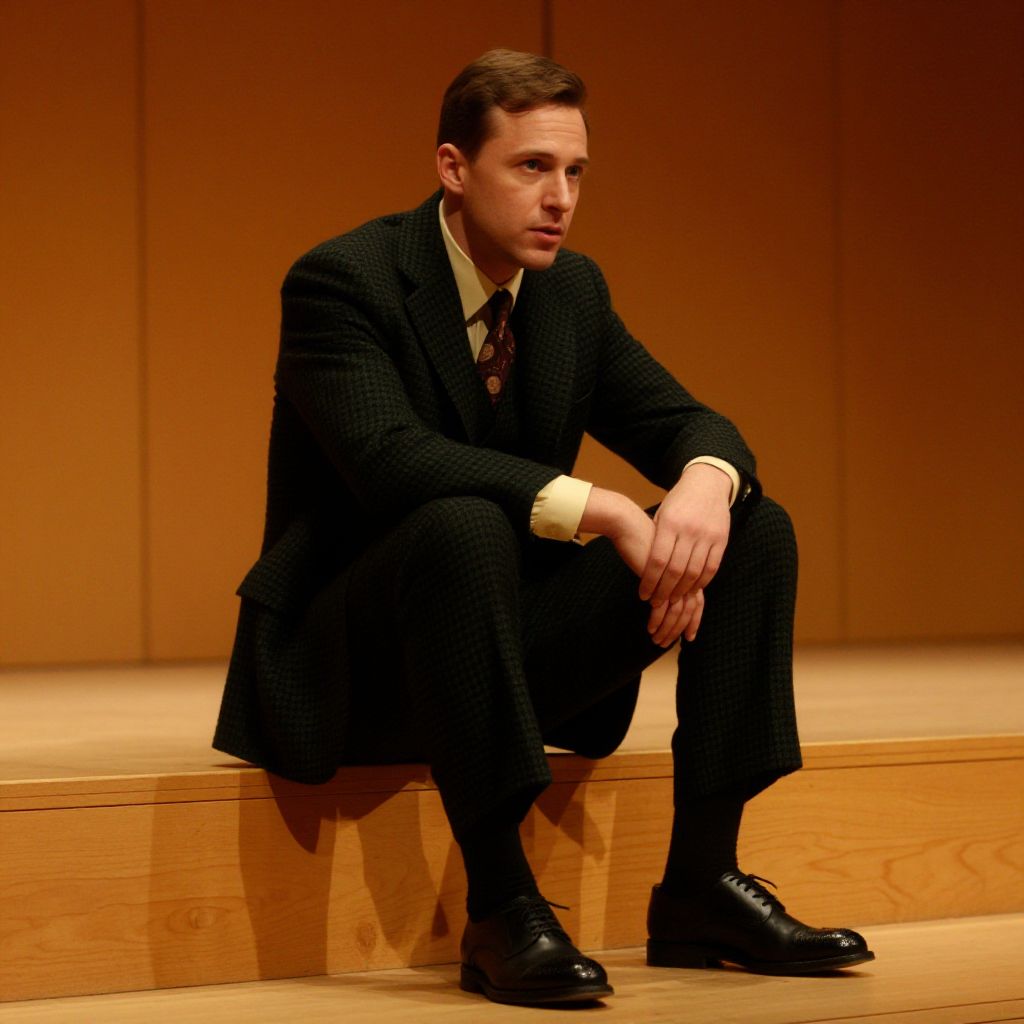 A man, classic houndstooth three-piece suit, rich wool material, dark green and black pattern, ivory dress shirt, patterned silk tie, black leather brogues, intimate wooden stage, warm acoustic panels, soft golden lighting, daguerreotype film, contemplative expression. Man has masculine face and piercing eyes