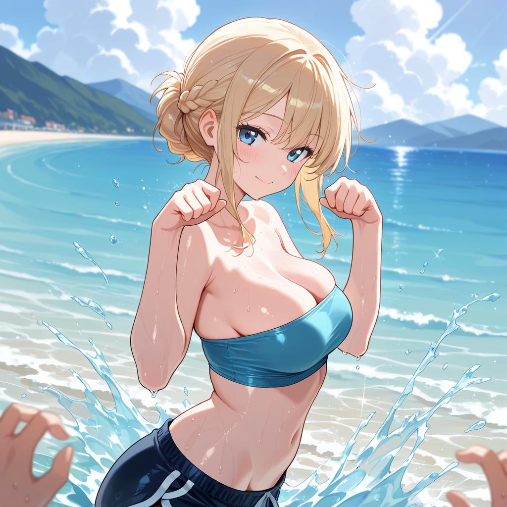 (masterpiece, best quality), 1girl, tube top, sideboob, wind, strapless, dolphin shorts, upper body, french braid, looking at viewer, wet, ((solo focus, intricate, paw pose, splashing, in water)), smile, pubis, beach, wide hips, blonde, medium breasts, blurry, mountainous horizon, cloudy sky