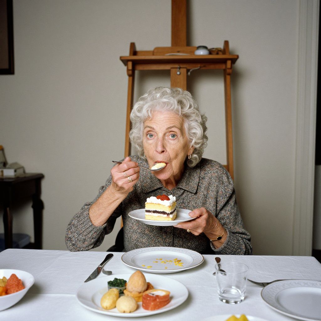Easel elderly woman eating cake on a dinner, photography shot by David LaChapelle, 4K, realistic photography,