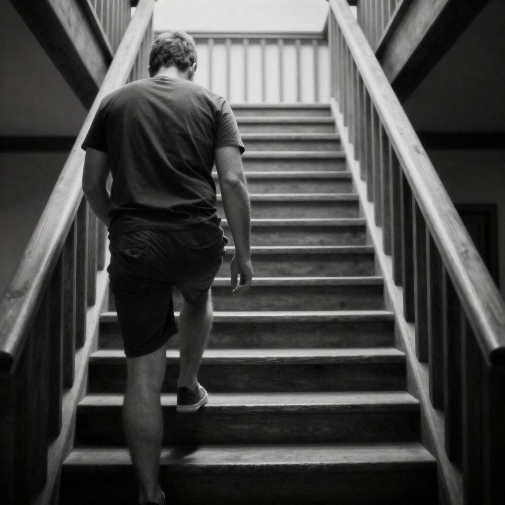 Man Climbing Staircase in Dramatic Light