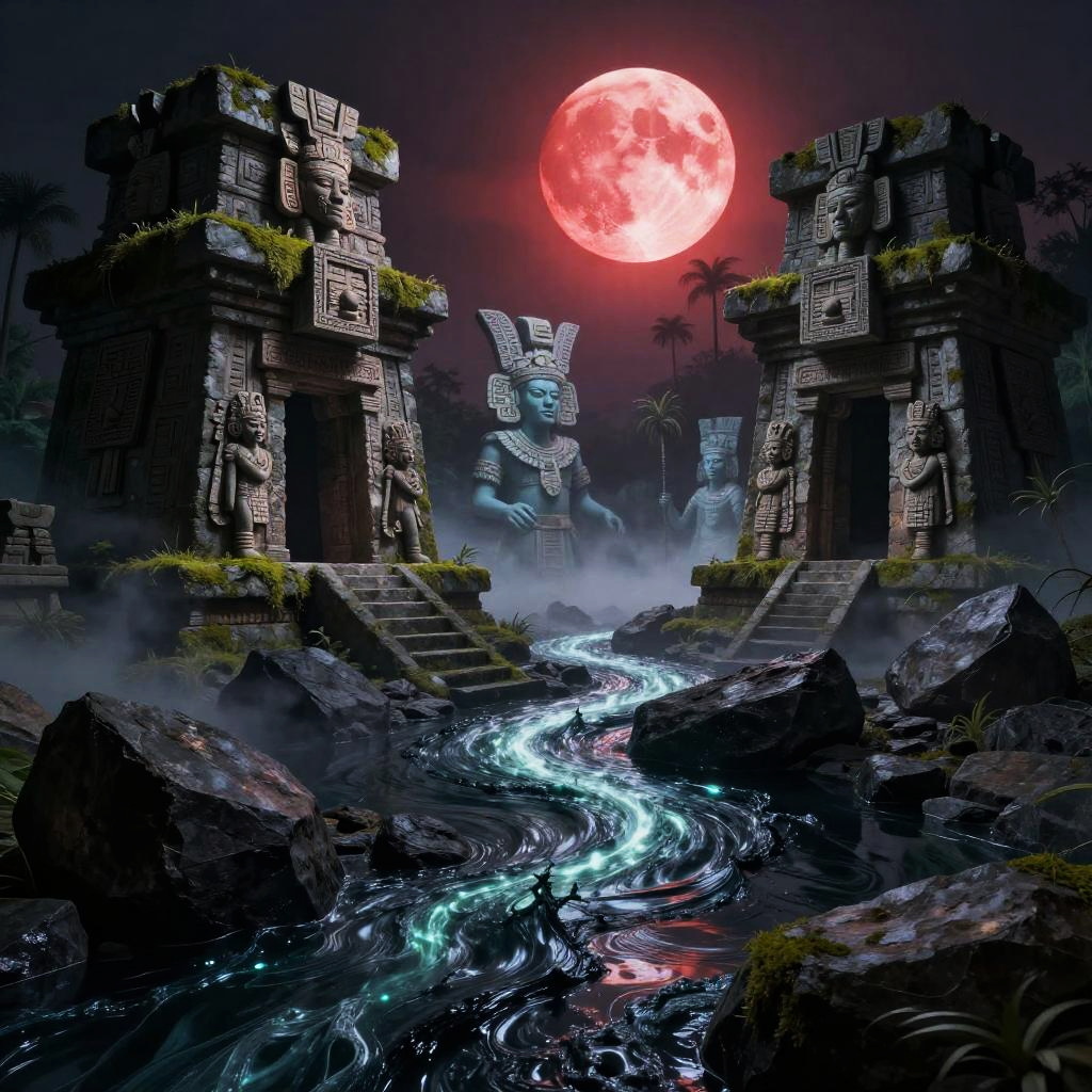 Xibalba as a surreal dark fantasy realm with jagged rocks and gloomy rivers of glowing obsidian, ancient stone temples covered in moss, and ghostly figures wearing traditional Mayan headdresses emerging from the mist under a blood red moon.