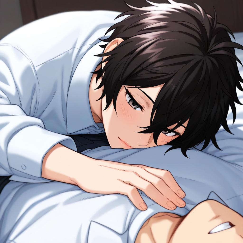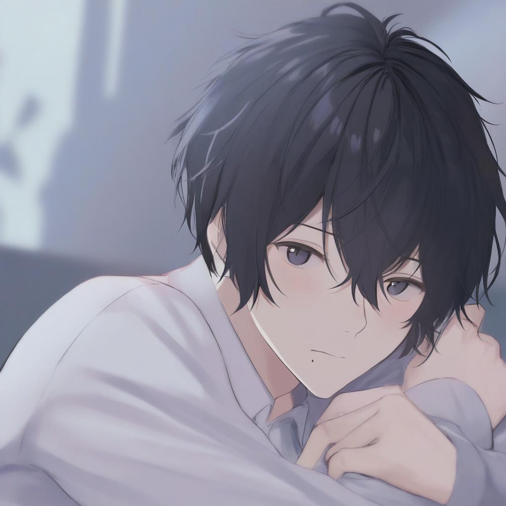 Digital anime-style illustration of a young man with messy, black hair and pale skin, lying down with a slightly melancholic expression. He has piercing blue eyes and is wearing a white, long-sleeve shirt. His hands are clasped near his face, adding to the introspective mood. The background is a blurred, soft blue, suggesting a serene indoor setting. The lighting is gentle, highlighting his delicate features and the smooth texture of his hair and skin. The overall atmosphere is calm yet introspective.