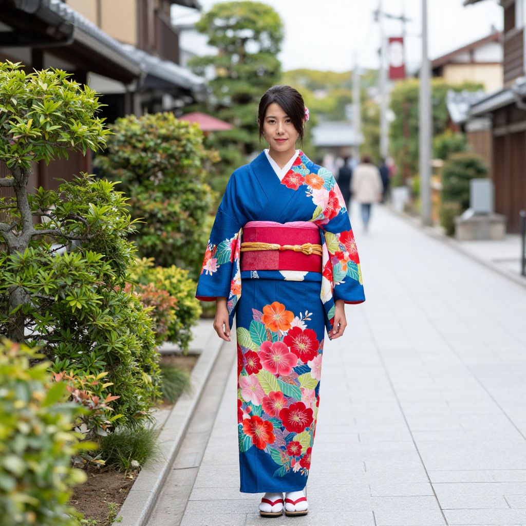 Woman wearing a vibrant floral-patterned kimono with a bold red obi belt stands gracefully in a traditional Japanese street setting, surrounded by neatly trimmed greenery and modern architectural details.