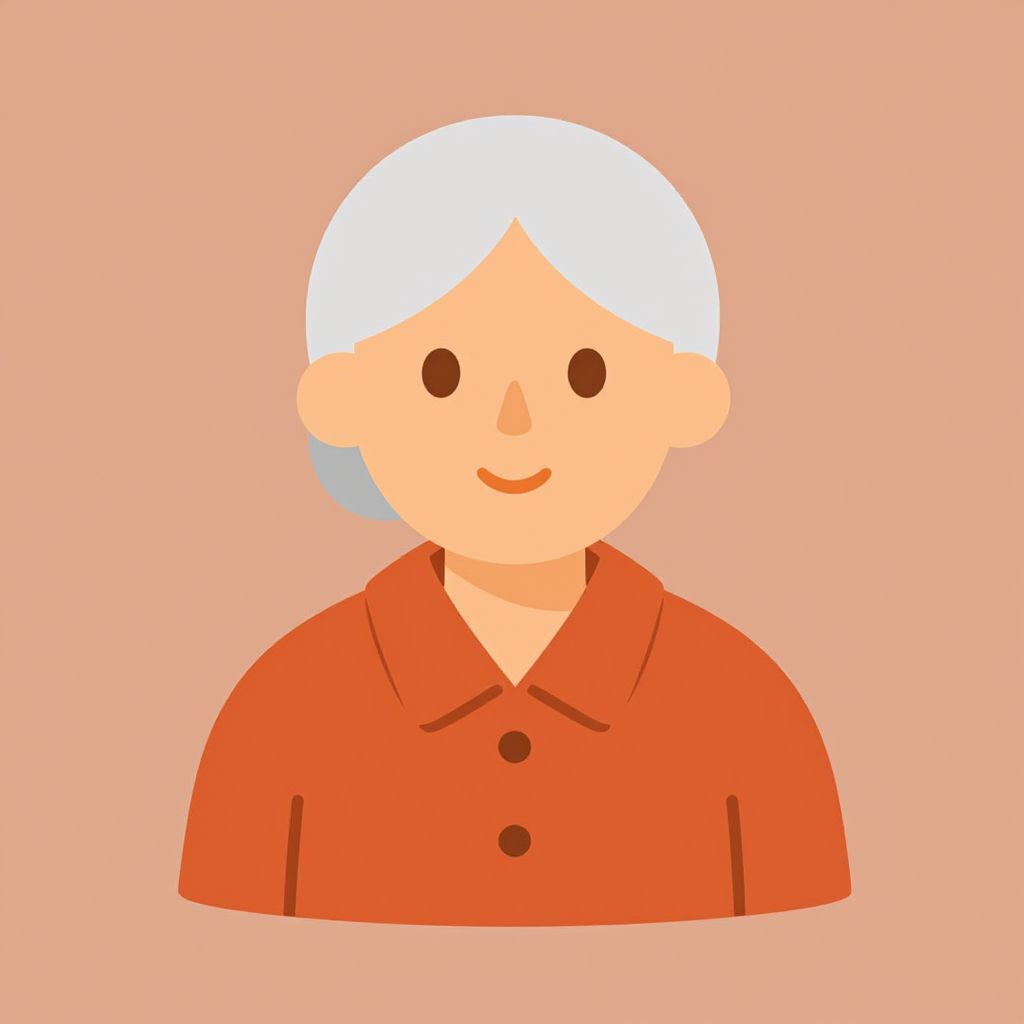 Digital illustration of a smiling elderly person with white hair, wearing an orange button-up shirt, set against a peach background.