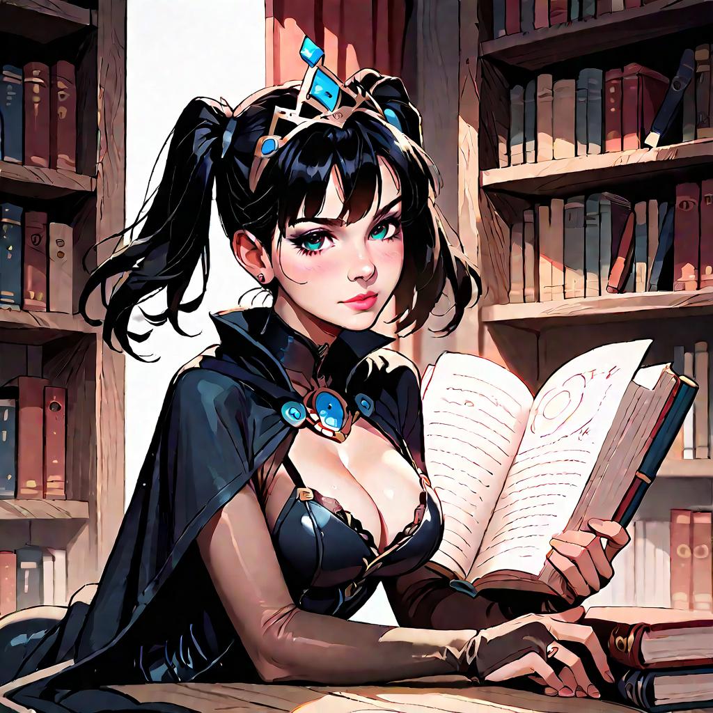 Digital artwork of an anime-style female character with black hair styled in two high ponytails, wearing a tiara, a black cape, and a revealing bodysuit with bridal gauntlets. She is reading an open book in a library setting with wooden bookshelves stacked with books in the background. The character has large expressive eyes, an arched back posture, and is looking directly at the viewer.