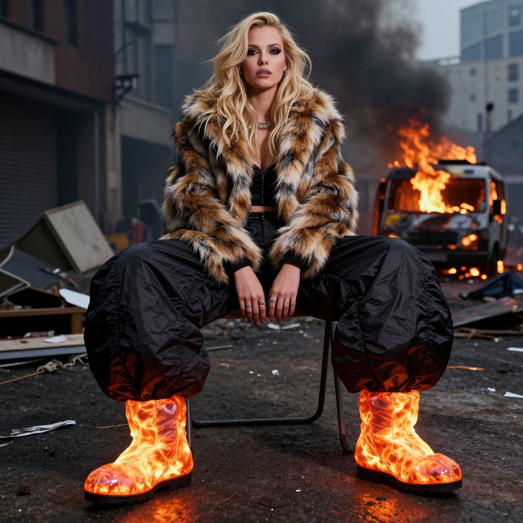 A cinematic fashion photoshoot featuring an Italian blonde model with fierce confidence, The model is seated casually in an urban, post-apocalyptic setting, her expression is nonchalant yet captivating, She wears a flamboyant, inflated pair of pants that billow out dramatically, contrasting against the gritty backdrop, Her shoes are equally bold, inflated and glowing from within with a fiery, almost lava-like light, creating an eerie glow on the ground beneath her feet, Behind her, chaos ensues as a van burns in the distance, the flames reflected in her fiery footwear, She pairs this dramatic ensemble with a statement faux fur jacket, exuding luxury and rebellion, The mood is intense and rebellious, blending high fashion with a gritty, almost dystopian world, creating a striking visual narrative of power and defiance