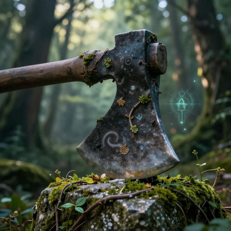 Close-up of a weathered axeblade embedded in a stone pedestal, vines and moss creeping over its surface, soft dawn light filtering through a dense enchanted forest, mystic symbols faintly pulsing with magic.