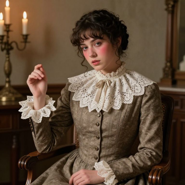 Prudish figure portrayed in an ornate lace collar and conservative dress, sitting primly on a wooden chair in a candlelit room, faint blush on cheeks, delicate hand gestures, detailed Victorian era textures, soft shadows and highlights