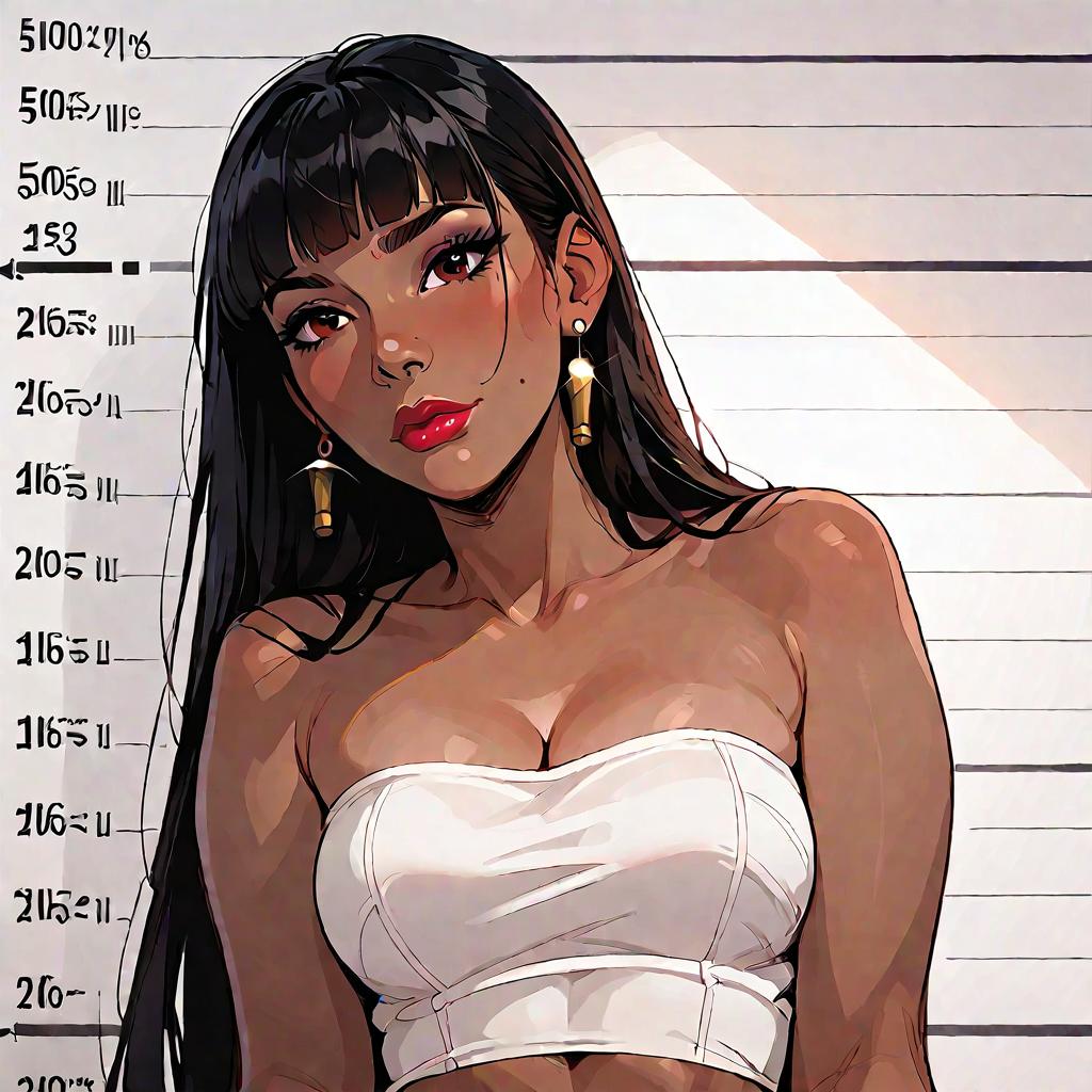Score_9, score_8_up, score_7_up, score_6_up, score_5_up, score_4_up, , source_cartoon, source_anime, 1girl, chel, black hair, long hair, blunt bangs, brown eyes, dark skin, lipstick, tube top, cleavage, bare shoulders, earrings, mugshot, sad