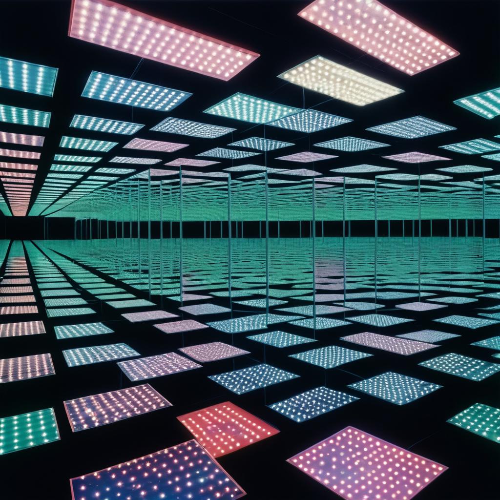 Jacquard An photograph titled Lost In Illusion by William Eggleston of a series of reflecing mirrors, and optical illusions. a lot of neon lights in the distance. dark image In the background, deep outer space with stars in the distance. mirage,