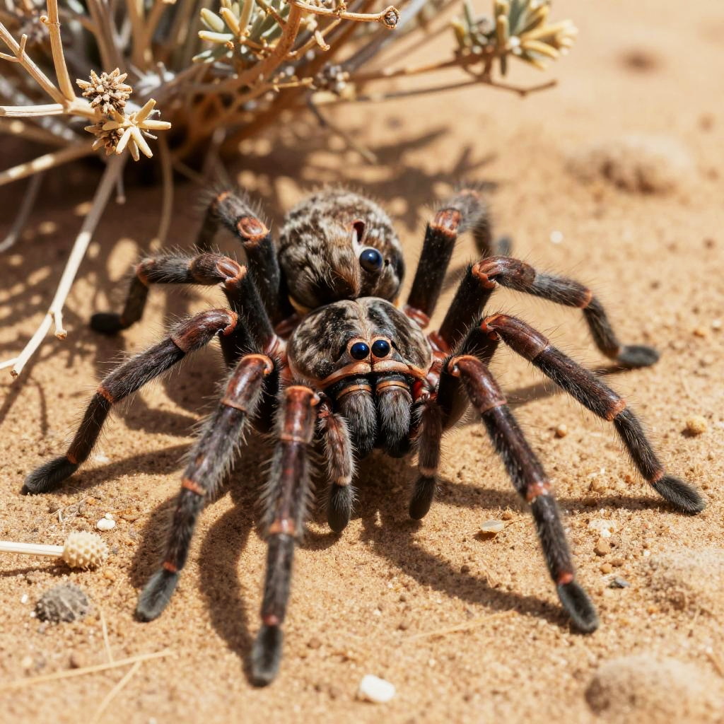 Dynamic scene of a Rango spider hunting amidst dry desert shrubs, aggressive posture, sharp focus on multiple eyes and fangs, textured sandy ground, warm sunlight filtering through sparse leaves, dramatic contrast and naturalism in insect behavior.