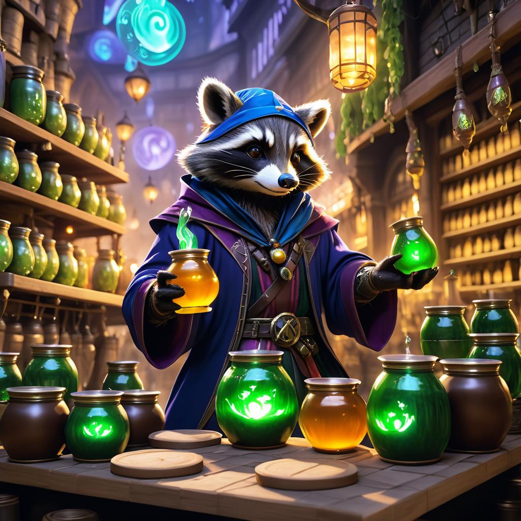 Anthropomorphic Raccoon Rogue Brewing Potion
