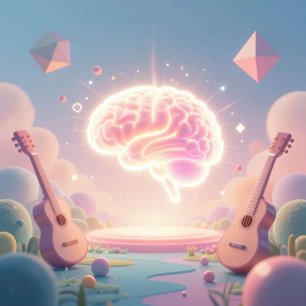 Album cover AI generator depicting a dreamlike landscape with floating geometric shapes and digital textures, a glowing AI brain at the center radiating energy, surrounded by musical instruments and pixelated elements in soft pastel hues.