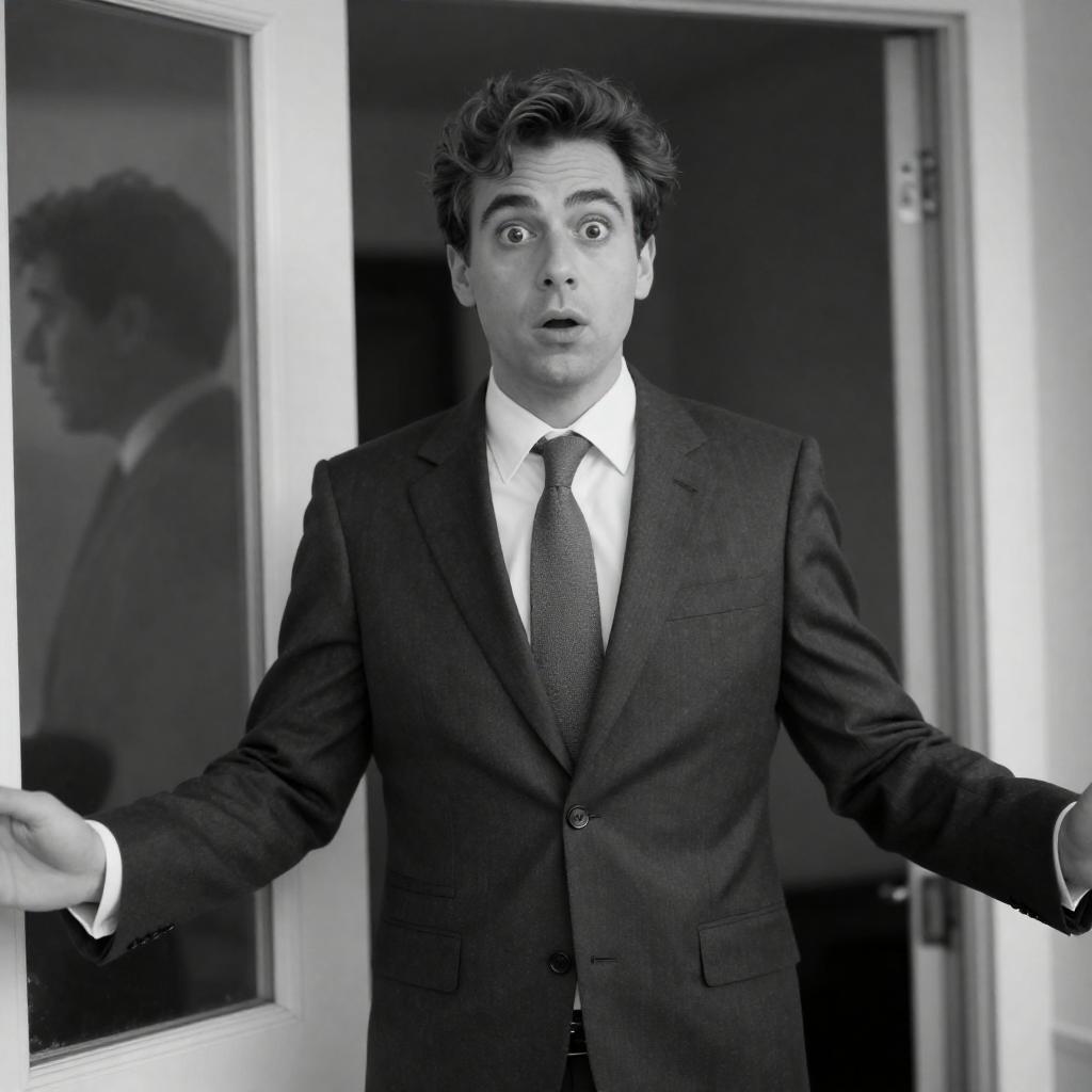 Black-and-white photograph of a man with short, wavy hair, wearing a dark suit, white shirt, and tie, standing in a doorway with arms outstretched. His expression is wide-eyed and surprised. Reflection of his face is visible in the glass to the left.