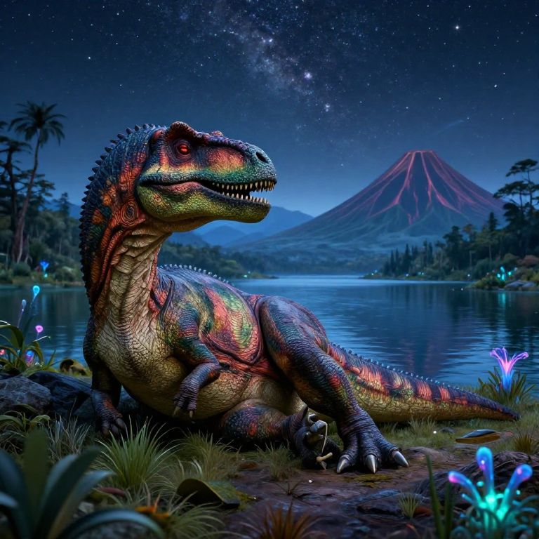 Dinosaur resting near a serene lake with mountains and volcanoes in the background under a starry night sky, bioluminescent plants around, surreal and mystical mood, intricate textures, hyper-detailed and vivid colors, fantasy realism style.