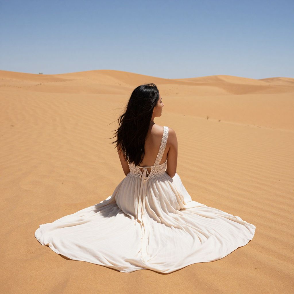 Woman seated with her back turned, wearing a flowing off-white dress with delicate lace straps, gracefully positioned atop a vast expanse of golden sand dunes under a clear blue sky.