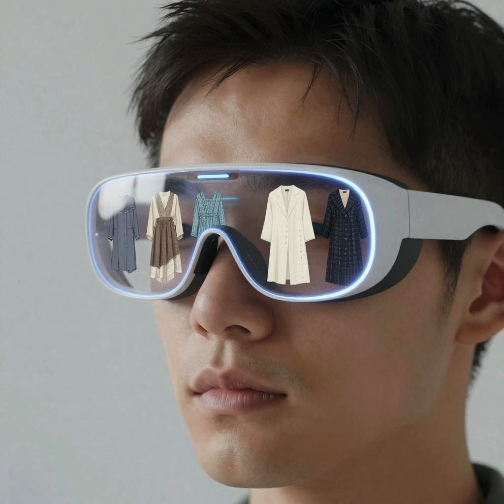 See through clothes filter online, close-up of augmented reality glasses projecting see-through clothing designs onto a user, detailed textures of layered fabrics, sleek and minimalistic user interface elements, glowing digital effects, sci-fi inspired setting