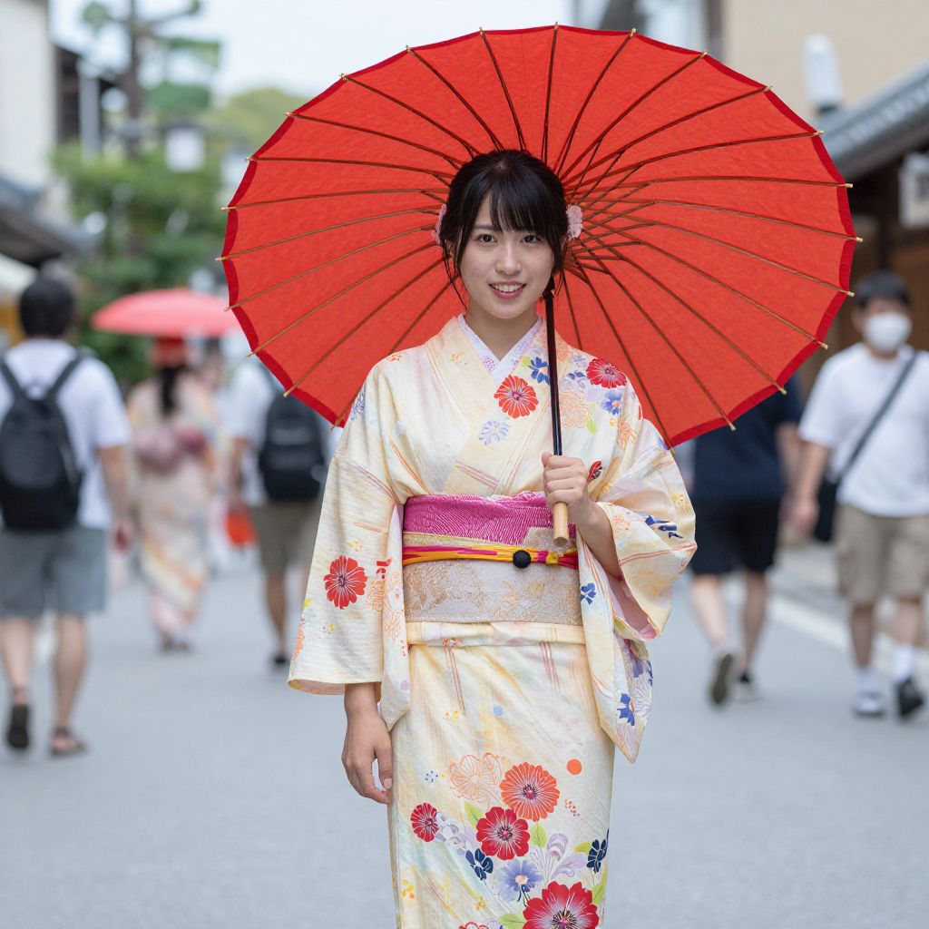 Photograph of an Asian woman with fair skin and black hair, wearing a traditional white kimono adorned with red and blue floral patterns, and a pink obi belt. She holds a large, vibrant red paper umbrella above her head. She stands in a busy urban street with blurred pedestrians in the background, some holding red umbrellas. The street is lined with buildings and trees, with a mix of casual and traditional attire among the people. The image has a bright, colorful aesthetic, emphasizing the contrast between her kimono and the red umbrella.