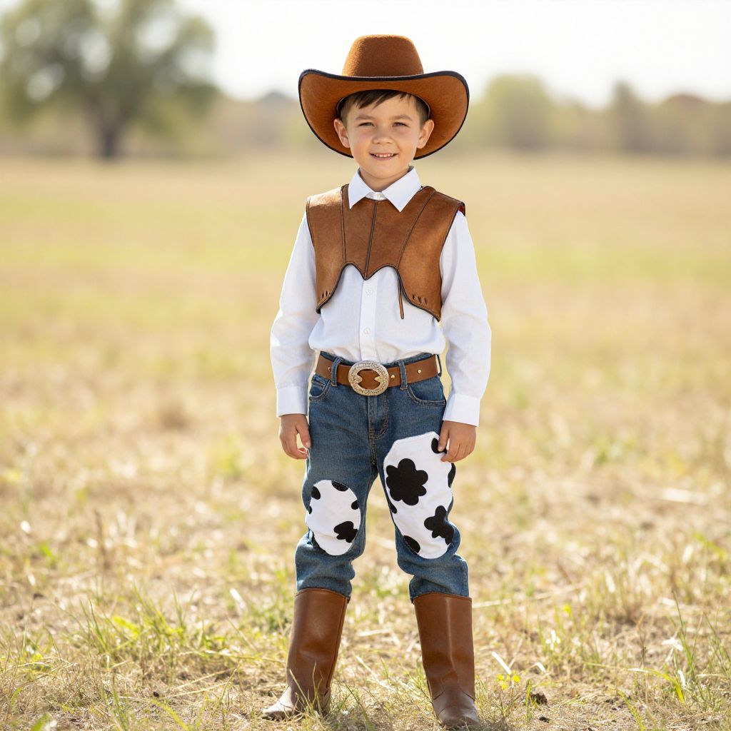Photograph of a young boy standing in a sunlit, grassy field. He has light skin, short brown hair, and is smiling. He wears a brown cowboy hat, white long-sleeve shirt, brown leather vest, blue jeans with black and white cow patterns on the legs, and brown cowboy boots. A brown belt with a large, ornate buckle is fastened at his waist. The background is softly blurred, featuring a tree and an expansive field under bright sunlight. The boy's attire and the setting evoke a rustic, western theme.