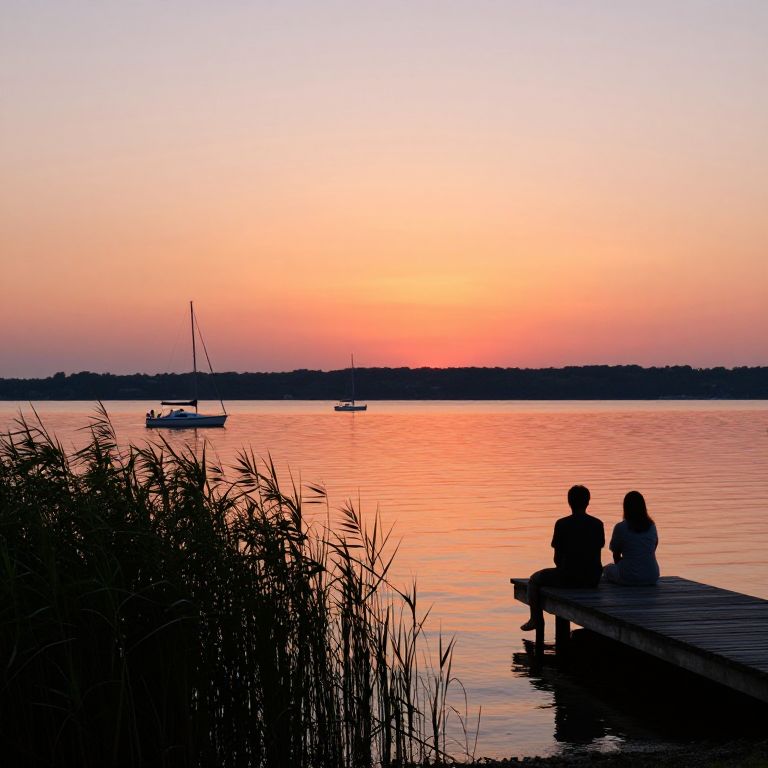 Summer: A peaceful lakeside sunset with orange and pink hues reflecting on the calm water, silhouettes of sailboats drifting, tall reeds swaying gently in the breeze, a couple sitting on a dock watching the sky, romantic and warm mood with realistic lighting and textures.