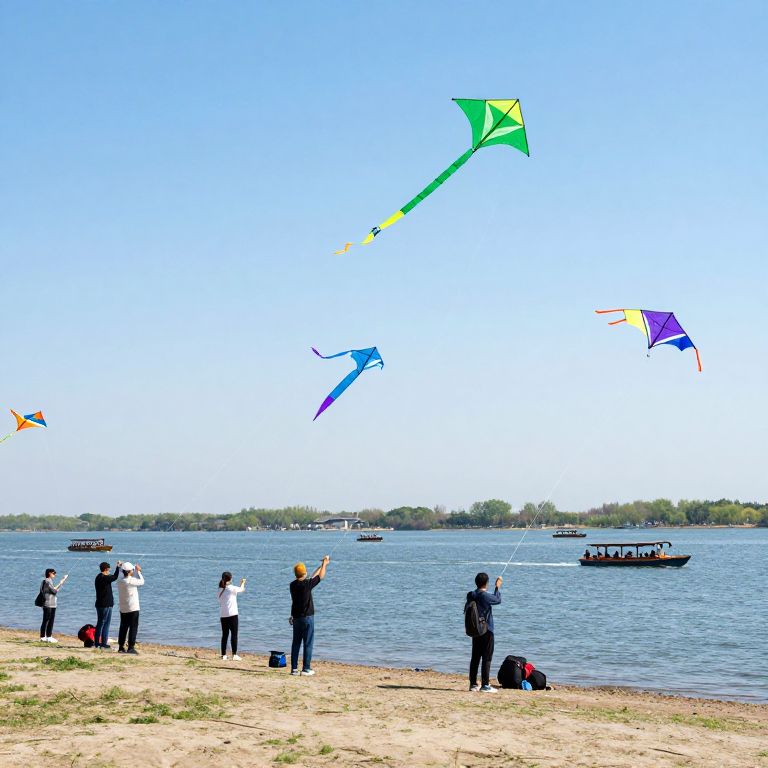 Lively kite-flying enthusiasts gather along a serene lakeside, launching vibrant kites—green, yellow, blue, and purple—with colorful tails soaring high against a clear blue sky, while boats gently float on the calm water in the background.