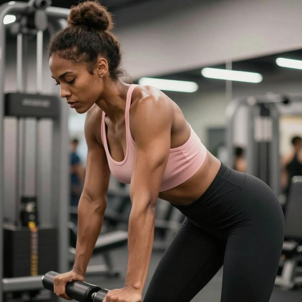 Photograph of a muscular woman with dark curly hair, wearing a bright red sports bra and black capri leggings, gripping a thick black rope while standing on a red running track. She wears red athletic shoes and looks determined. The background includes a black chain-link fence and blurred urban buildings.