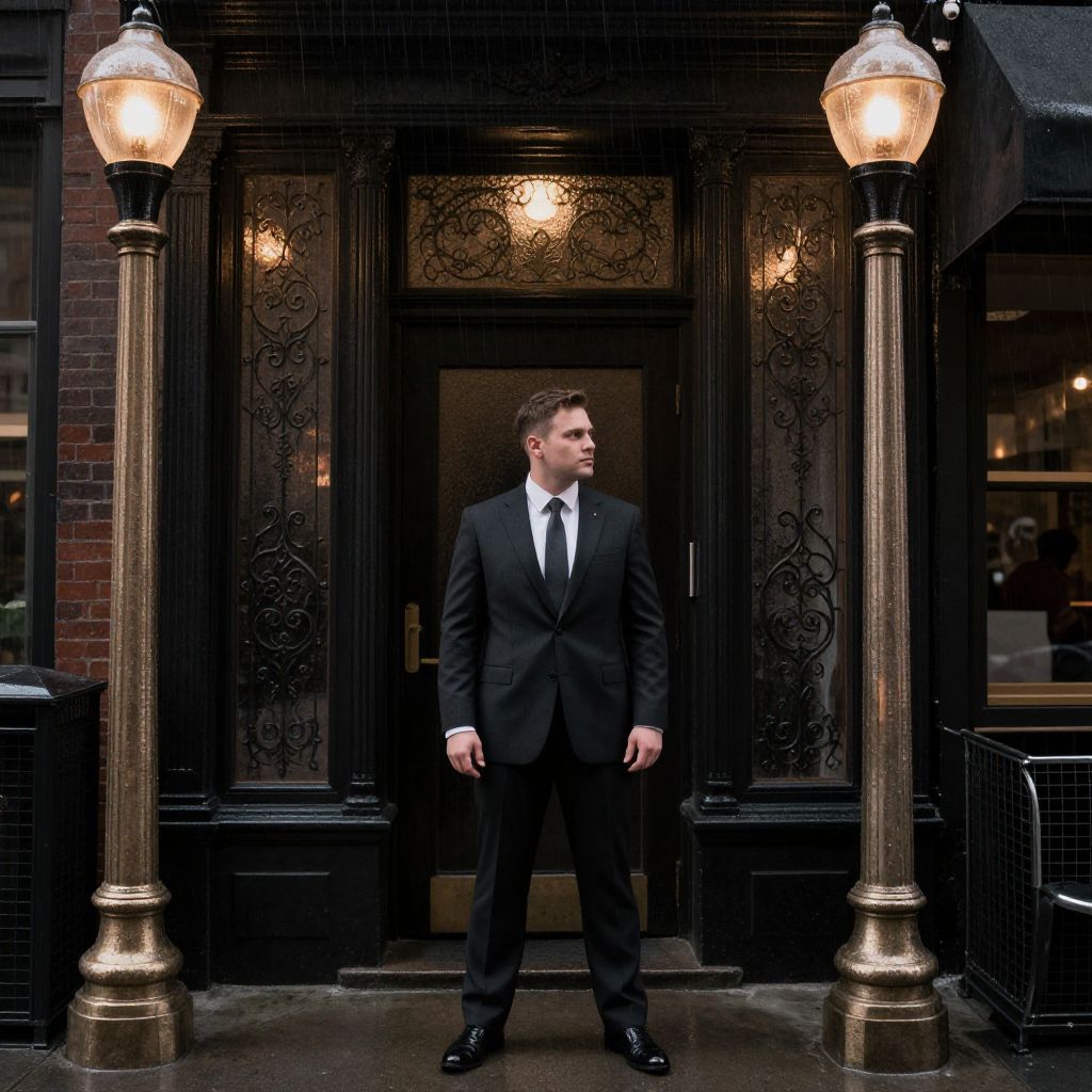 Photograph of a young white man with short brown hair, standing in front of a dark, ornate brick building entrance. He wears a black suit, white dress shirt, and black tie, with polished black dress shoes. Two vintage-style street lamps with glowing amber lights flank him on either side. The entrance has intricate black wrought iron detailing and a brass door handle. The scene is dimly lit, with a wet sidewalk suggesting recent rain. The background includes a glimpse of a glass window to the right.