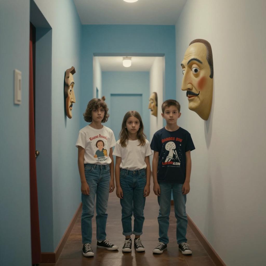 Three children standing in a narrow corridor with blue and white walls, featuring large Salvador Dalí-style face masks mounted on the walls. The children wear casual outfits with jeans and graphic t-shirts, under soft, warm lighting that creates a dreamlike, artistic atmosphere.
