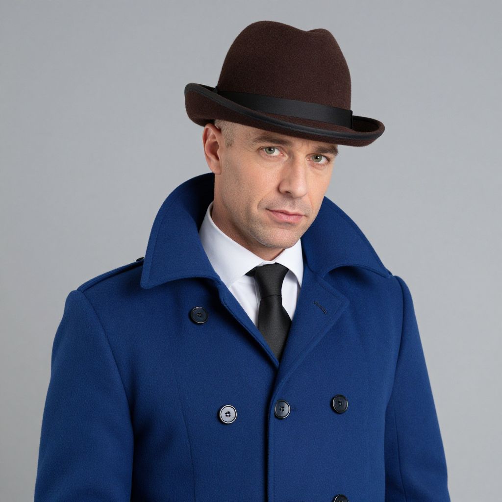 Photograph of a Caucasian man with light skin and short brown hair, wearing a dark brown fedora hat with a black ribbon. He has a clean-shaven face and is dressed in a navy blue, double-breasted overcoat with black buttons, over a white dress shirt and black tie. He has a slight, confident smile and is looking directly at the camera. The background is a plain, light gray, which contrasts with his dark clothing. The image has a crisp, professional studio quality.