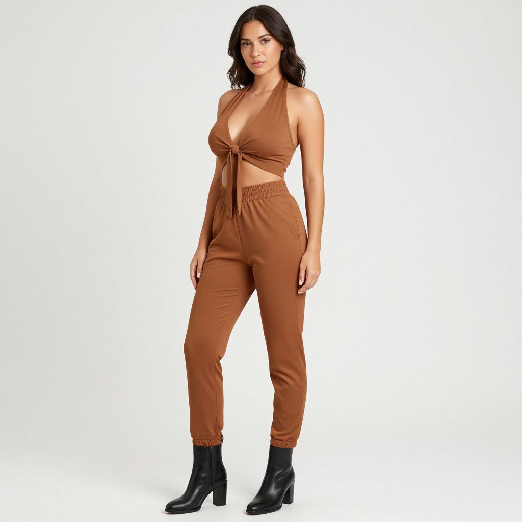 "Woman, casual contemporary, cropped halter top with a knotted front in a warm brown tone, matching high-waisted joggers with gathered elastic cuffs, ankle-length, black leather ankle boots with a mid-height block heel, plain white studio background.. Sexy. Pretty face and beаutiful eyes. Big breasts."