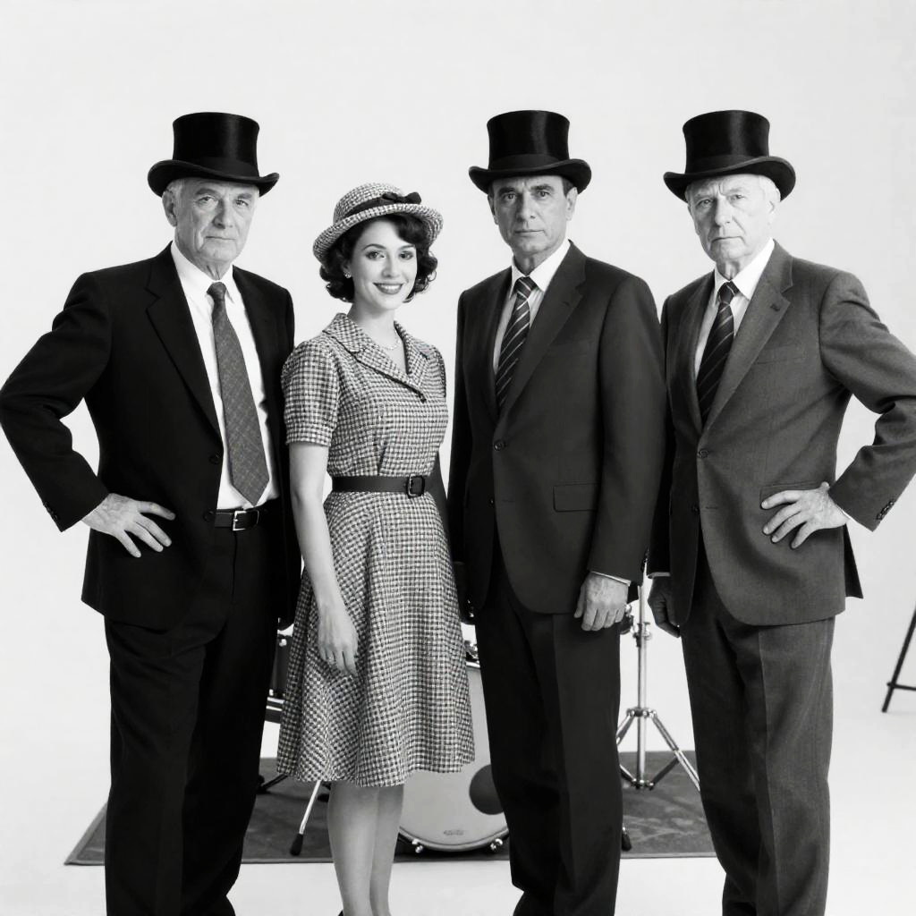 Black and white photograph of four people. Three men in suits and top hats, one woman in a checkered dress and hat. Drum set in background. Men stand with hands on hips or by sides, woman smiles. Smiling young man between woman and two older men. Intense expressions on two older men. Indoor setting.