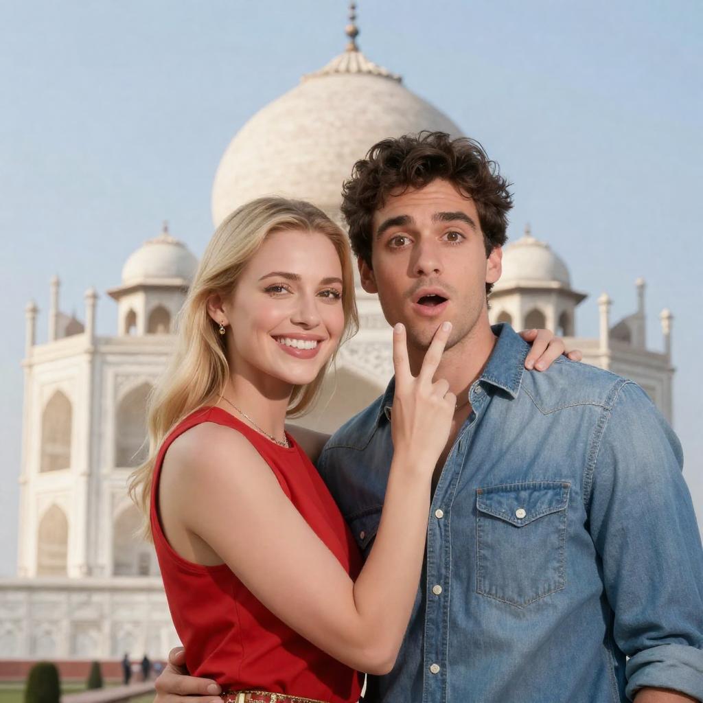 Photograph of a blonde woman and a dark-haired man. Woman in red sleeveless top, smiling, making a peace sign. Man in denim shirt, surprised, with hand on her cheek. Background shows a silhouette of Indian Taj Mahal domes. Woman's left arm around man's neck. Both smiling. Bright, clear background.
