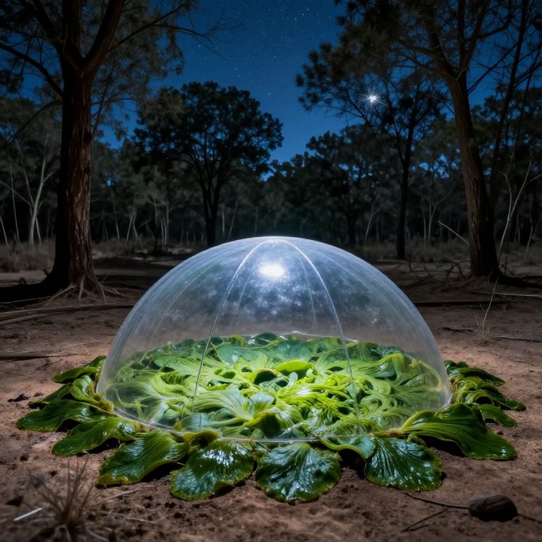 A forest of algae grows upside down beneath a transparent dome in the middle of an arid desert, thriving on starlight.