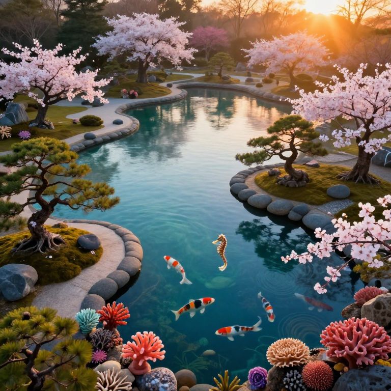 Photograph of a serene Japanese garden at sunset with a curved pond, pink cherry blossoms, colorful fish, and vibrant coral-like plants.